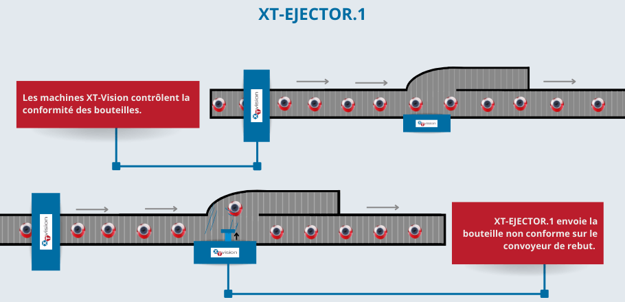 Standard Push Ejector: The bottle is pushed onto the reject conveyor.