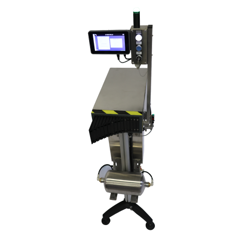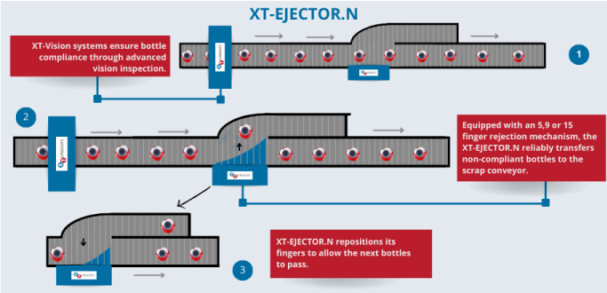 This machine diverts non-compliant bottles onto the exit conveyor using the successive action of 5, 9, or 15 fingers.